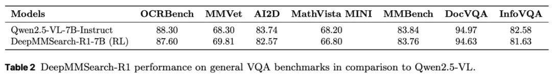 最后,采用 LoRA 模块进行的 SFT 以及带有 KL 惩罚项的在线 GRPO 训练能够保持模型的通用视觉问答(VQA)能力,如表 2 所示。苹果观察到模型在多个数据集上的性能保持稳定,这表明本文提出的模型在学习与网络搜索工具交互的同时,依然有效地保留了其通用的视觉理解与推理能力。