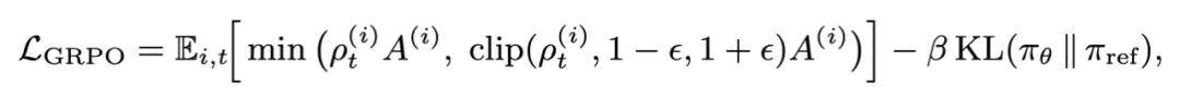该阶段的训练目标通过带截断的重要性加权代理进行优化,这虽与 PPO 类似,但引入了组相对优势的概念。其数学形式可表示为: