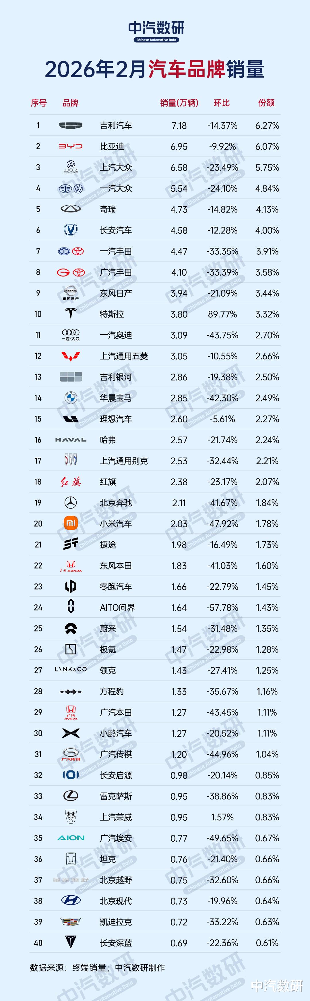 值得注意的是,头部品牌普遍面临环比下滑,吉利环比下降14.37%,比亚迪环比下降9.92%,上汽大众、一汽大众环比降幅更是超过23%。这主要受春节假期生产、销售节奏错位影响,属于季节性波动。特斯拉(3.8万辆,+89.77%)是TOP20中唯一实现环比正增长的品牌,环比增幅强势反弹,其销量也创下近期新高。