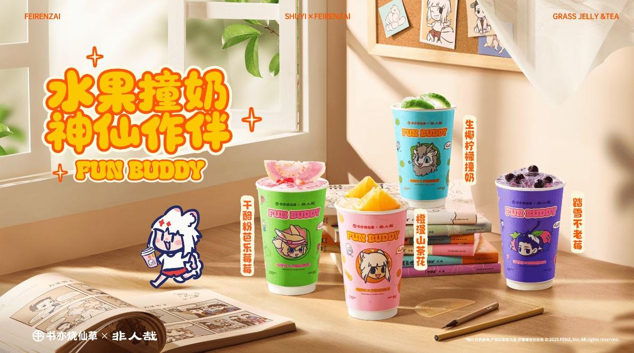 据介绍,书亦烧仙草与《非人哉》此次的联名产品,在产品设计上将漫画里四大热门IP形象和橙漫山茶花、踏雪不老莓等4款畅销产品进行趣味结合,通过漫画中的治愈故事与奶茶的情绪氛围深度融合,把"喝奶茶"升级为一场集社交、娱乐、文化于一体的沉浸式体验。