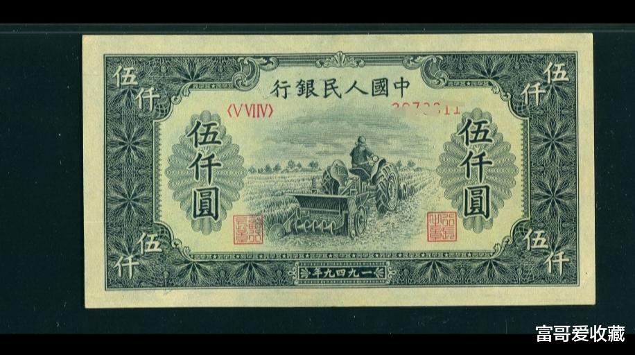 【5000元·耕地机版】这种类型的“5000元纸币”,发行时间为1950年1月20日,于1955年5月10日开始停用,纸币备注年份为“1949年”。