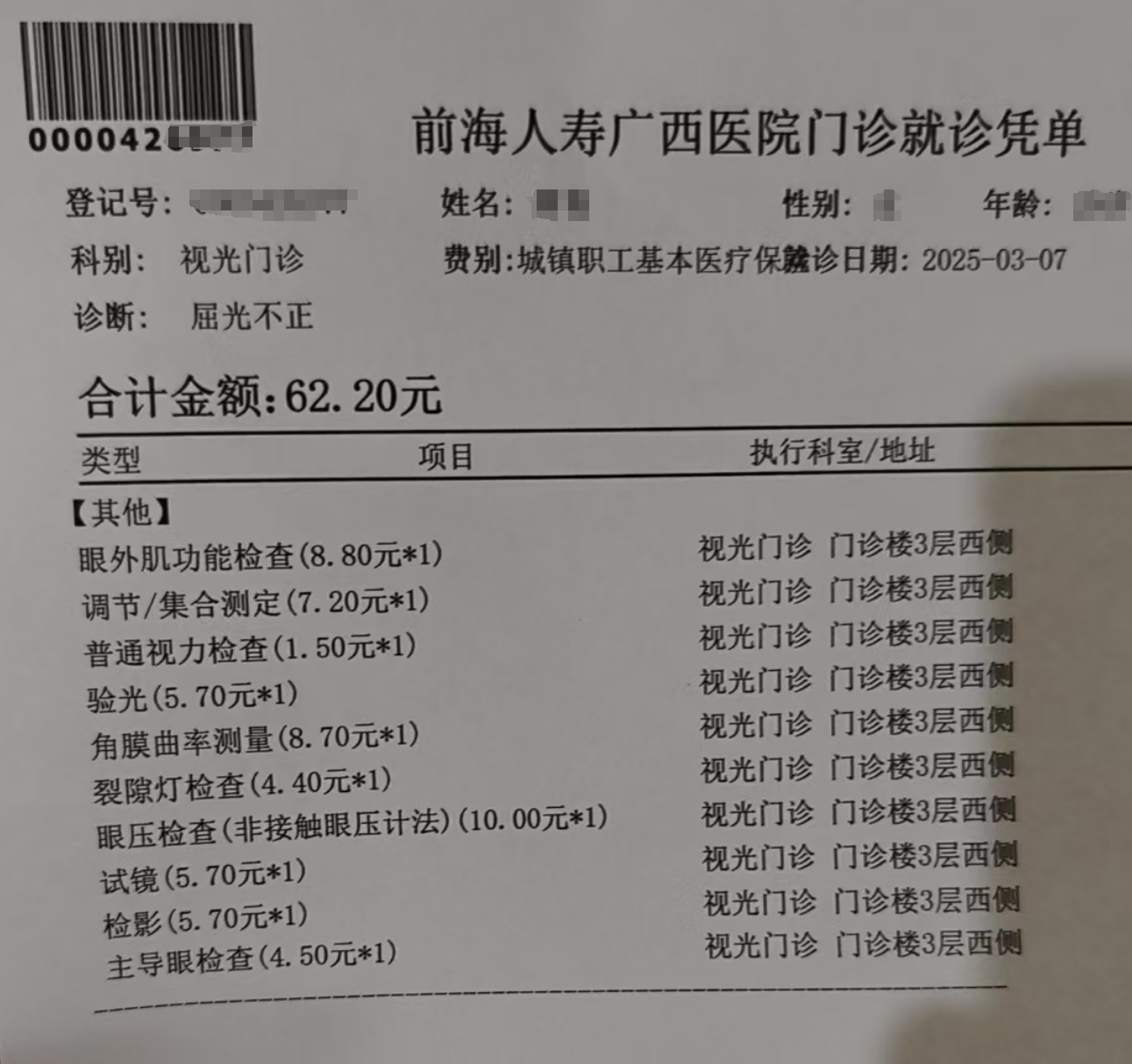 这是较瘦在本地前海人寿医院验光缴费单据,62.2元包含十大检查项目!