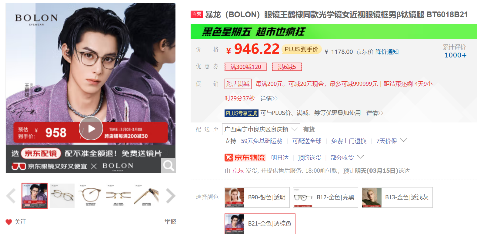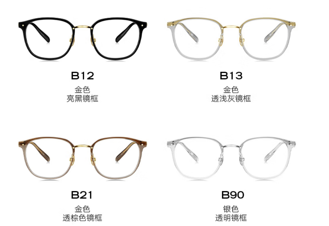 四个颜色挑花眼,广告主打款为B21金色,好好好,就选ta,材质是PP+纯钛,复古时尚型。