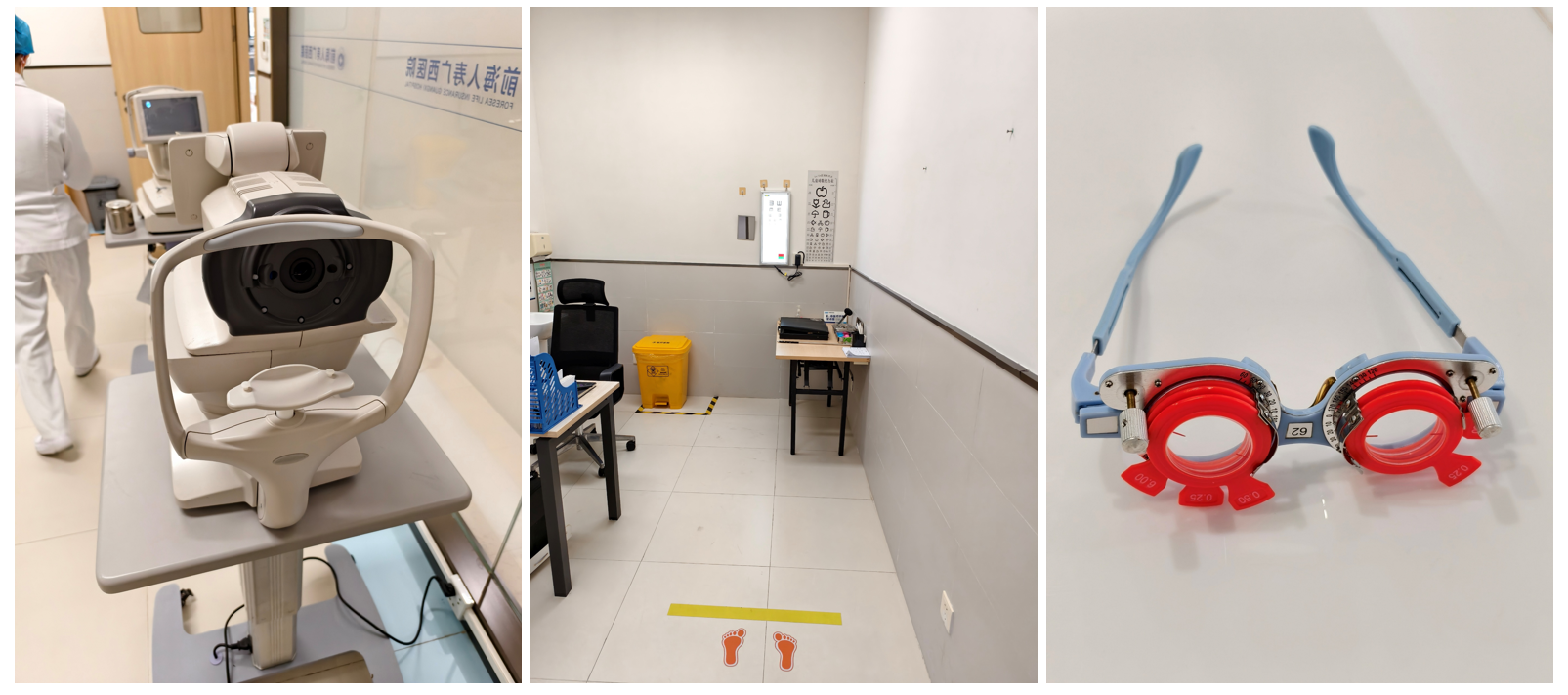 经历了什么呢?去眼镜店验光,也就上面这三件套吧?全自动验光仪、视力表与试配戴眼镜。
