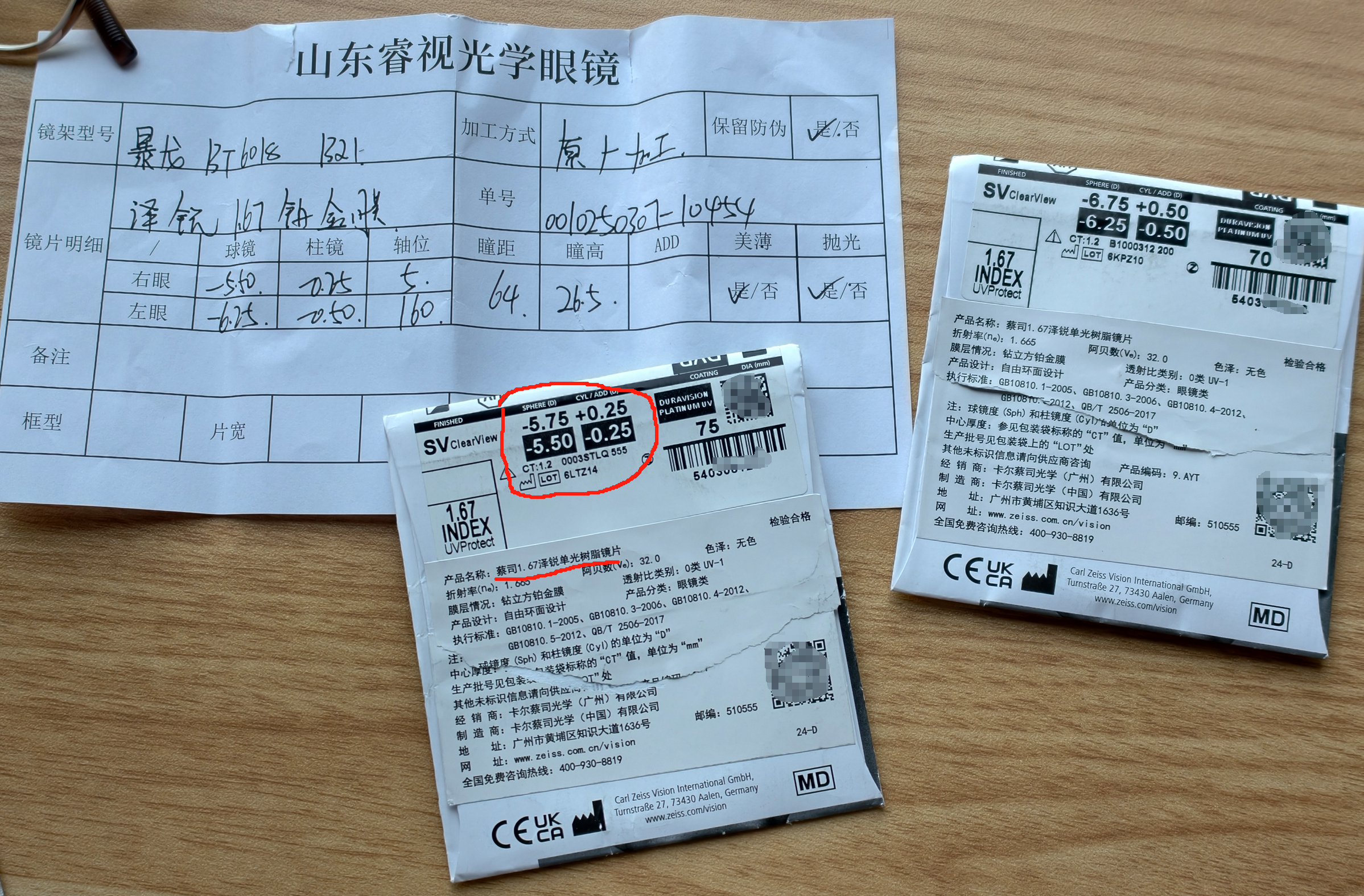第四步~注意上图圆形灰色的原厂装配章,这是发到上海蔡司工厂进行配镜的标签,如果是本地配镜是没有这个章的。
