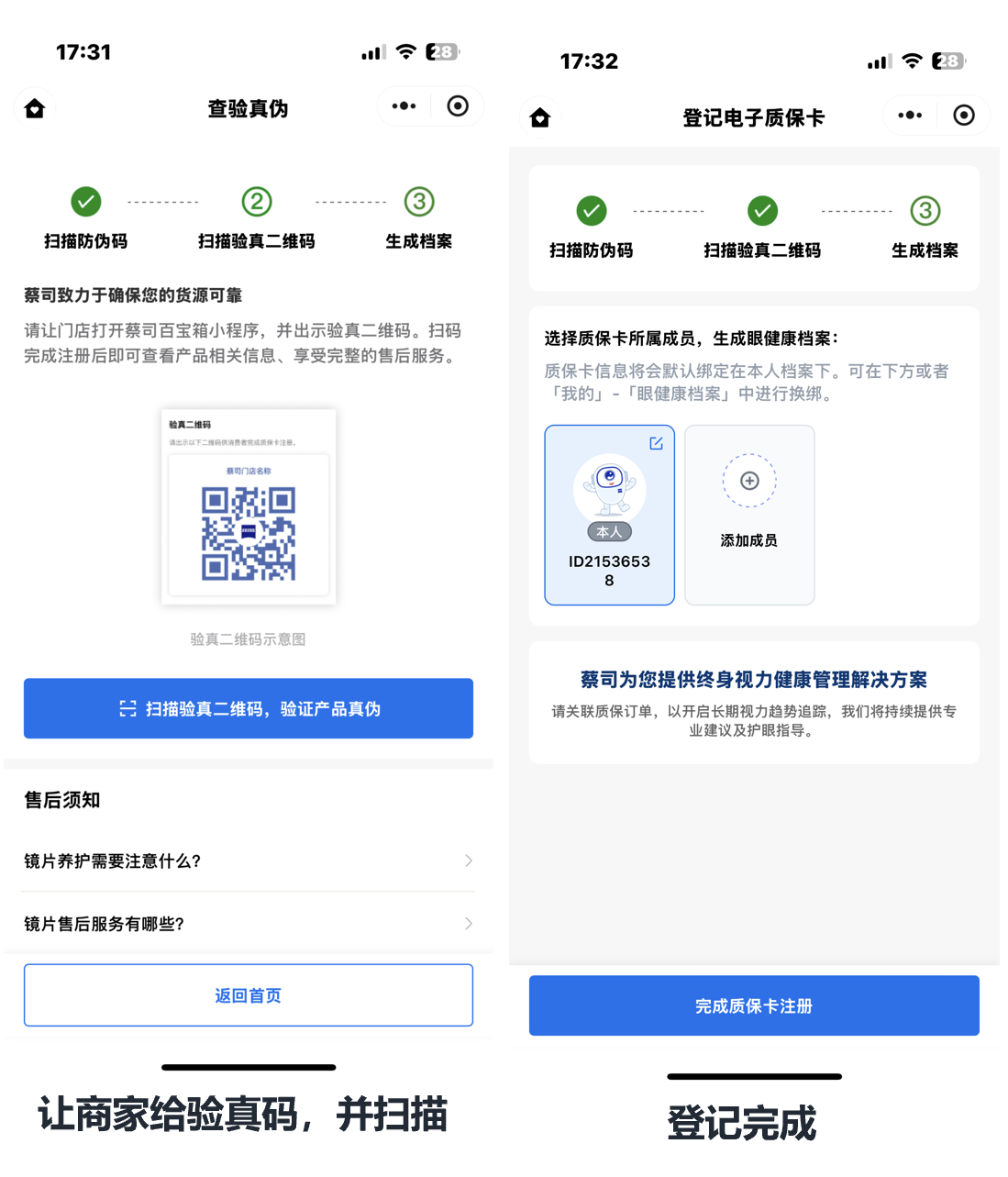简单总结:扫镜片包装袋二维码注册登记(一次性注册机制)——扫商家验证码确认——完成。