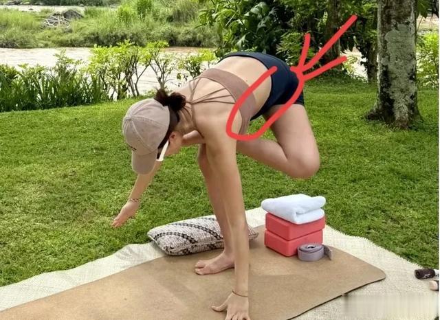杨采钰不惧太阳的暴晒和蚊虫的干扰,她直接在印尼河边的草地上做起了瑜伽。