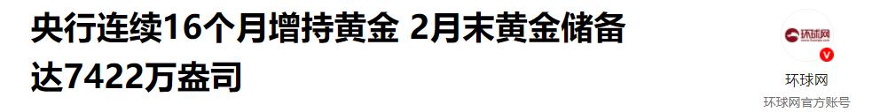 参考资料:《央行连续16个月增持黄金 2月末黄金储备达7422万盎司》——环球网