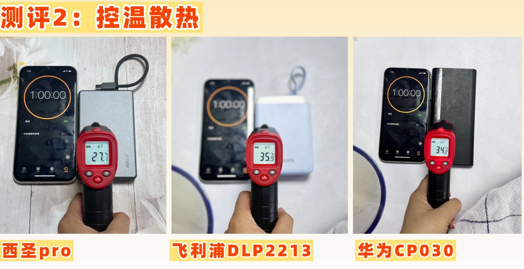 充电宝的控温能力真的直接关系到使用安全,这点大家一定要重视!要是一款充电宝充电时总发烫,要么是电芯质量拉胯,要么就是散热和控温设计没做到位。长期用这种散热差的充电宝给手机充电,很容易损伤手机电池,缩短电池寿命,想想都心疼~ 为了让大家看清这三款充电宝的实际控温表现,因此下面我专门做了个1小时的实测:初始温度都是24℃,接下来看看每款充完1小时后,温度会飙升多少,用真实数据说话!