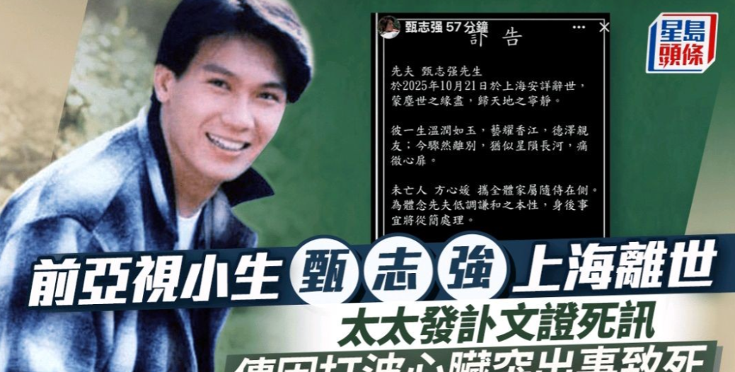 其太太方心媛发布噩耗,称甄志强于2025年10月21日在上海安详辞世。