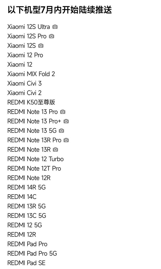 最后一批机型,将会在7月开始陆续推送,这一批机型大多都是老机型,包括7个型号共计26款产品,不过由于硬件等方面的不足,均不支持HyperAI功能和焕新极简相机功能(小米12S全系和红米Note 13、13R除外)。