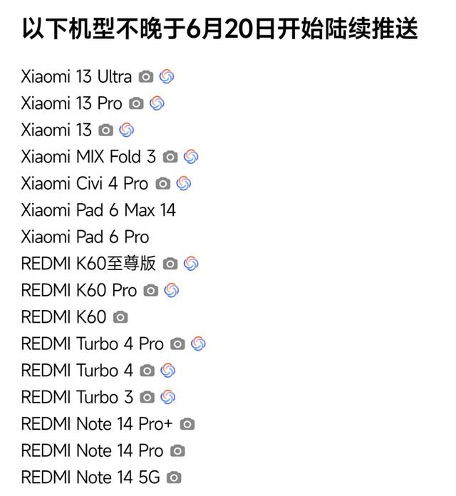 计划在6月20日之前升级的将会有7个系列16种机型,包括小米13系列(13、13 Pro、13 Ultra)、小米MIX Fold 3、小米Civi 4 Pro、小米Pad 6系列(Pad 6 Pro、Pad 6 MAX 14)、红米K60系列(K60、K60 Pro、K60至尊版)、红米Turbo系列(Turbo 3、Turbo 4、Turbo 4 Pro)、红米Note 14系列(Note 14 5G、Note 14 Pro、Note 14 Pro+)。其中,红米K60、红米Note 14系列三款机型仅支持换新极简相机,小米拼版6两款产品不支持焕新极简相机和HyperAI。