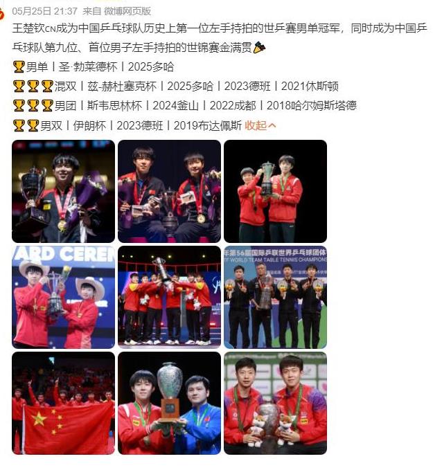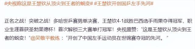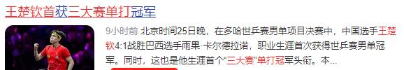 夺冠后,人民日报、央视等近百家媒体先后发文,高调赞扬了王楚钦,给足了冠军排面。