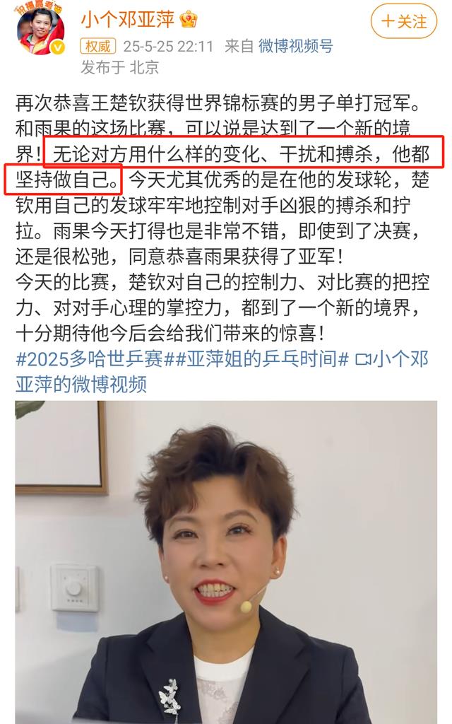 视频中邓亚萍对王楚钦的表现简单进行了一番总结,其中有句话让人印象深刻。