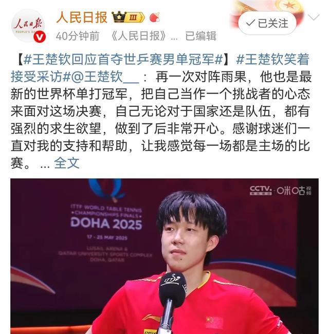 人民日报还特意转发了王楚钦的赛后采访,用文字的方式记录了冠军的夺冠感言。
