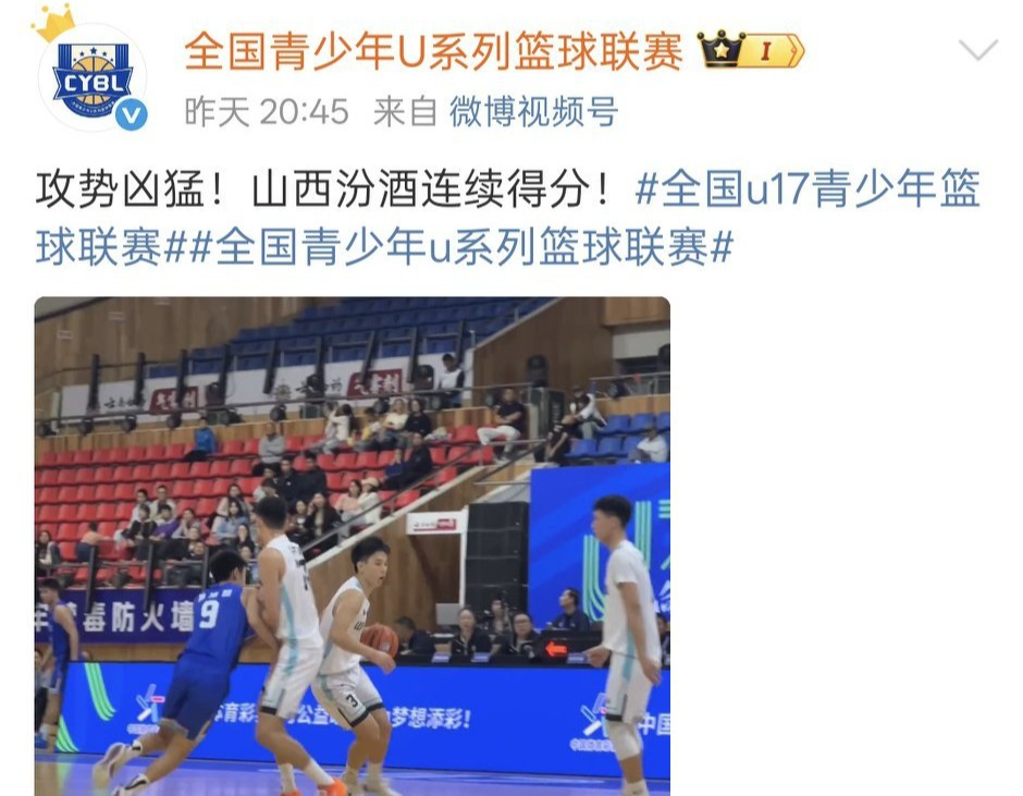 2025年全国U17青少年篮球联赛男子组昨天晚上举行了16进8的多场比赛。其中,U17山西汾酒男篮在与江苏U17男篮的比赛中,攻势凶猛如潮,连续得分能力超强,首节大比分拉开分差,半场确定胜局,下半场成为“垃圾时间”。