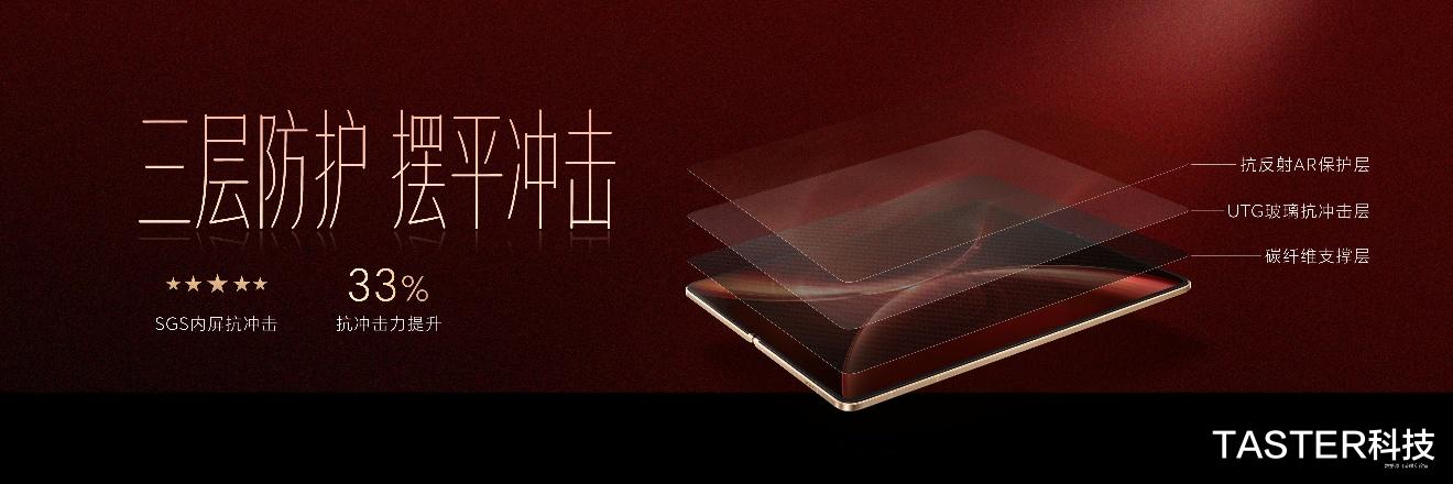 内屏同样有至臻黑钻屏旗舰素质。全新升级超韧UTG玻璃,折痕相比上一代产品改善44%,通过了SGS无感知折痕认证,呈现出仿佛没折的平滑效果。同时,通过碳纤维支撑层、UTG玻璃抗冲击层、抗反AR保护层等三层防护,抗冲击力提升33%,由内到外,可靠属性拉满。