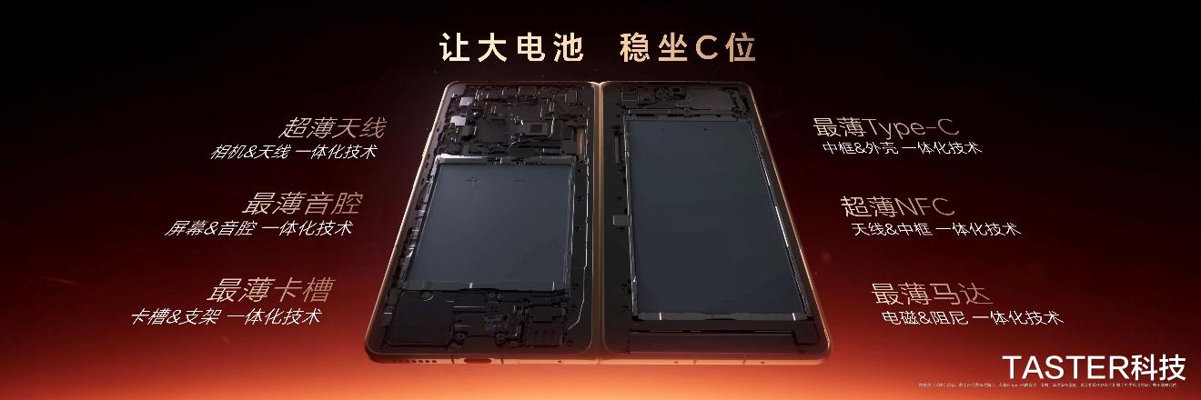 在内部设计方面,为了在极限空间里给电池留下足够空间, 荣耀Magic V6针对内部空间做了系统性考量,对天线、音腔、卡槽、Type-C、NFC、马达等组件进行极致轻薄化处理,让电池稳坐C位。