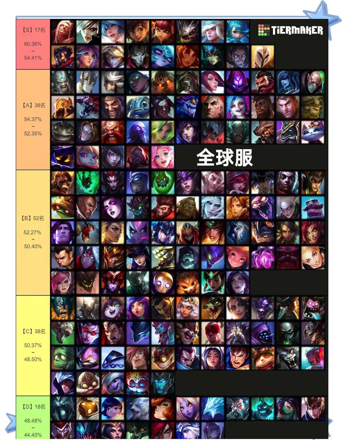 我翻了下国服数据,T0英雄亚索、剑魔胜率稳在58%。