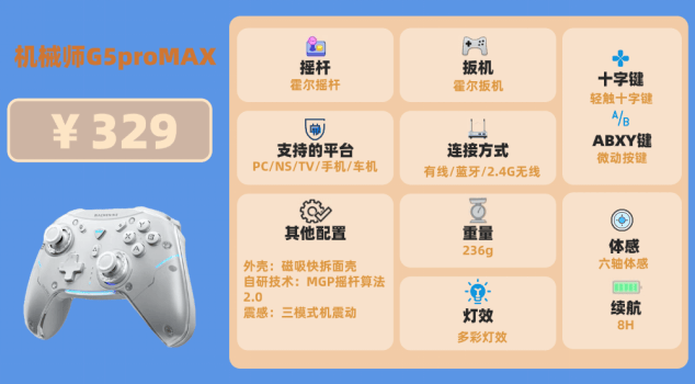 手柄整体偏清爽的白色机甲风,外壳做了微喷砂处理,手感细腻也不容易粘指纹。整机的布局沿用经典非对称配置,上手几乎没有学习成本。摇杆采用阻尼可调TMR结构,可在30~90gf间无级调节,行程更短、弹性更紧凑,快速转向手感不错,但如果你是慢慢推准心的那类玩家,会觉得前半段阻尼略硬,不是特别“跟手”。扳机支持线性和微动双模式切换,游戏场景差异明显;ABXY采用机械微动按键,响应快、回弹清脆,但键程属于较短路线,对喜欢深键程的玩家来说手感可能偏“轻”。