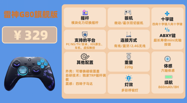 手柄机身曲线做得蛮贴手的,长时间玩动作游戏也不累。外观这次给了冰雪白、星夜紫、曜石黑等多色选择。TMR摇杆确实改善了中段“空”的老问题,回中顺滑,微调准星很轻松,只是默认阻尼偏轻一点,刚上手需要稍微适应。双切扳机在赛车和射击之间来回切换都能明显感到手感差异;四枚背键可自定义,一些复杂连段可以直接一键触发。RGB灯效模式多,效果炫,不过默认亮度偏强,晚上玩建议调低一些。六轴体感识别准确,动作游戏里转向、瞄准都还挺自然。