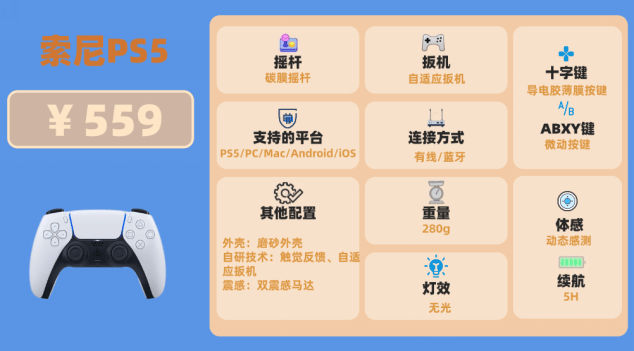 手柄外壳的磨砂触感细腻且防滑,长时间握着也不会觉得手心腻或者累。按键和摇杆布局依旧是索尼那套熟悉的体系,自适应扳机和细腻触觉反馈又是这代手柄最核心的亮点——不同游戏会给你不一样的阻尼与震感,比如赛车里的油门力度、射击时的压枪感,都能被它表现得比较逼真。唯一的小遗憾是,用久了某些自适应场景下阻尼会稍微偏硬一点,触觉反馈在极个别游戏里也会显得有点“过头”,但这种设计在手柄当中还是比较有个性化的。