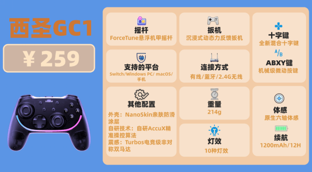 配置方面,西圣GC1同样诚意满满。它搭载电竞级极速连接引擎,支持2.4G、蓝牙和Type-C三模,输入延迟低至0.5ms,连接稳定、操作顺畅;原生六轴体感精准捕捉旋转、倾斜、挥动等动作,射击和赛车操控更稳;214g轻量化机身+15°握角+NanoSkin亲肤防滑涂层提供舒适贴合握感;半透明幻雾晶透机身+10种RGB灯效模式兼顾科技感与视觉沉浸;全平台兼容,无论手机、PC还是Switch都能轻松畅玩。综合来看,这套配置在百元价位中非常罕见,性价比十足。