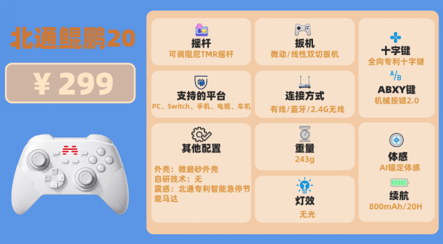 震动方面支持AI场景自适应,细节表现比同价位产品更足;十字键段落感自然,方向触发易上手。连接方式覆盖有线、蓝牙5.3与2.4G,三模切换顺畅,兼容PC、Switch、手机、电视和车机等多个平台。续航为20小时,同时支持边玩边充基本不会影响体验。