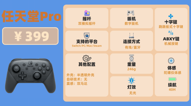 无线稳定性一直是Pro手柄的强项,在Switch上几乎没有延迟焦虑;连PC、Mac也都很顺畅,尤其是Steam游戏支持度非常高。续航一次性可以使用40小时,不用多说,属于能连玩好几天那种,加上充电方便,不太需要管理电量。