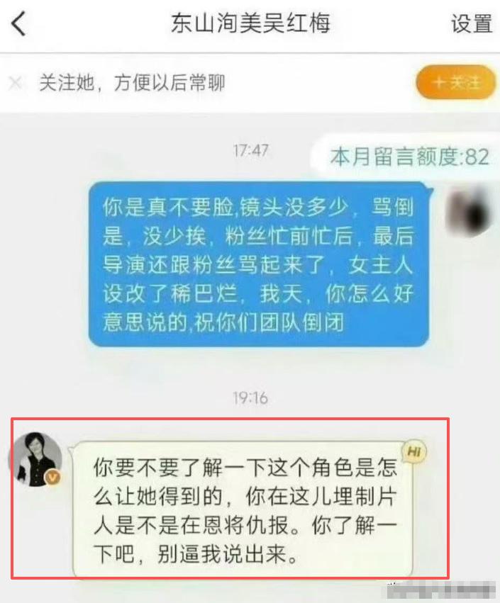 粉丝去制片人吴红梅社交账号讨说法,对方不仅不认错,反而私信威胁:“你要不要了解一下这个角色她是怎么得到的?别逼我说出来。”