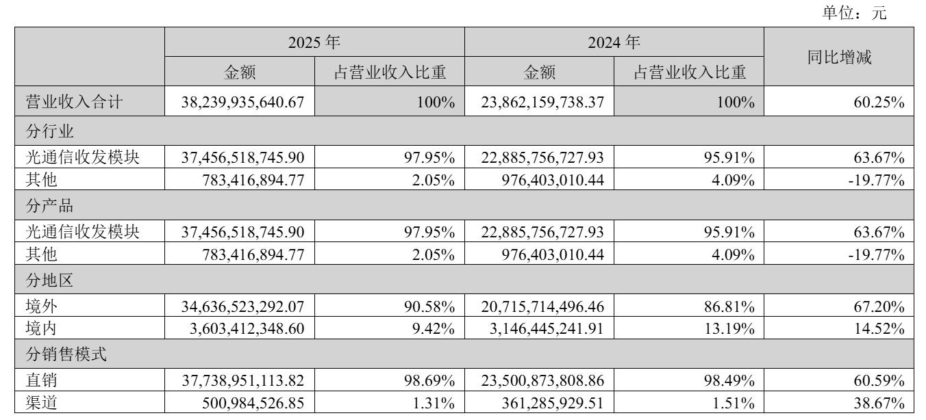 DoNews4月13日消息,中际旭创股份有限公司(证券代码:300308 证券简称:中际旭创)日前发布财报。财报显示,中际旭创2025年营收为382.4亿元,较上年同期的238.6亿元增长60.25%。
