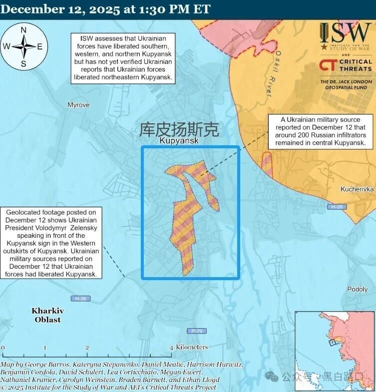 12月12日,泽连斯基视察库皮扬斯克,在城市半毁的入口标志旁录制视频,随后在社交媒体发布,视频录制地点俄军最近阵地2公里,视频中还可以听到炮声。