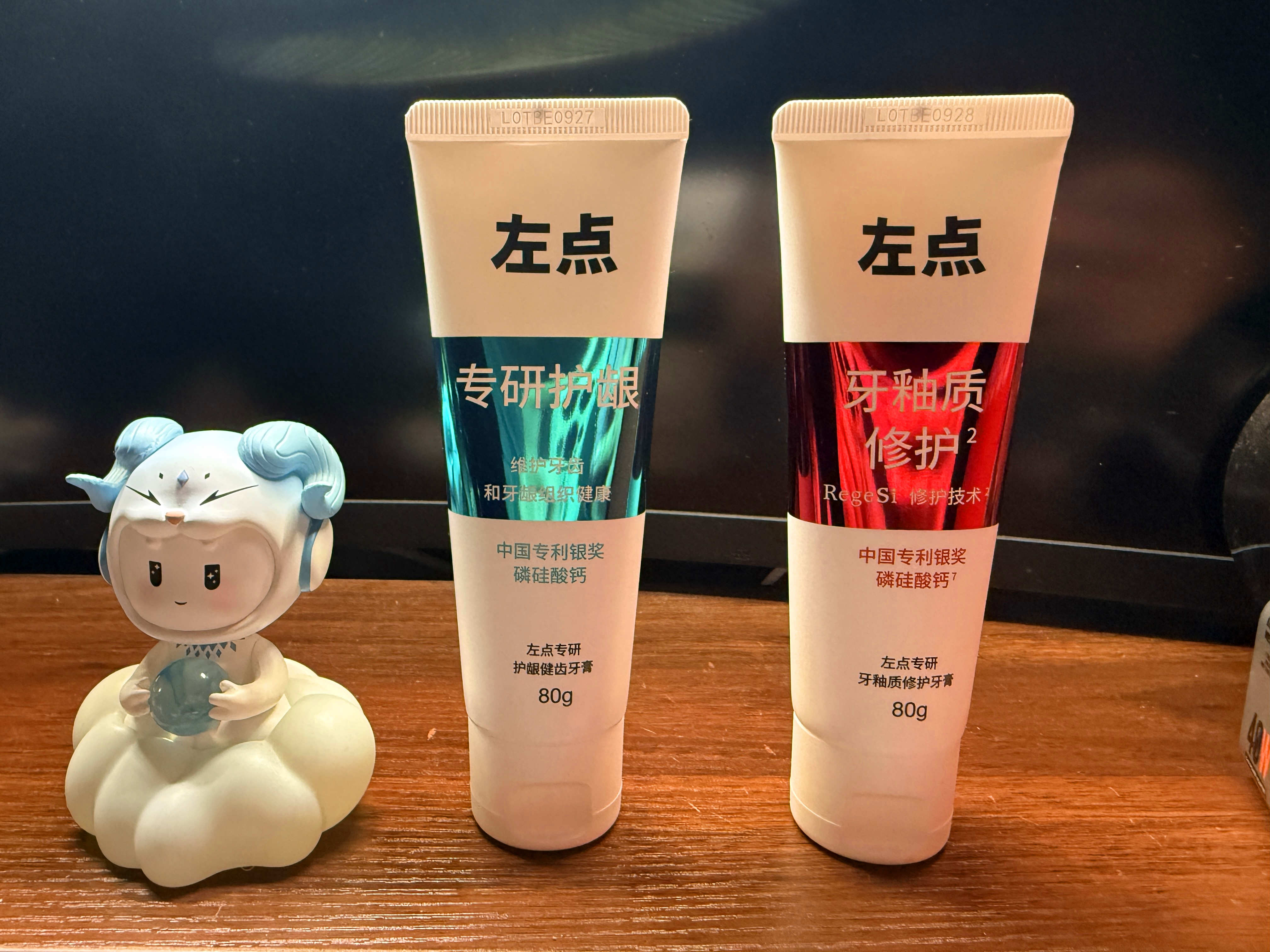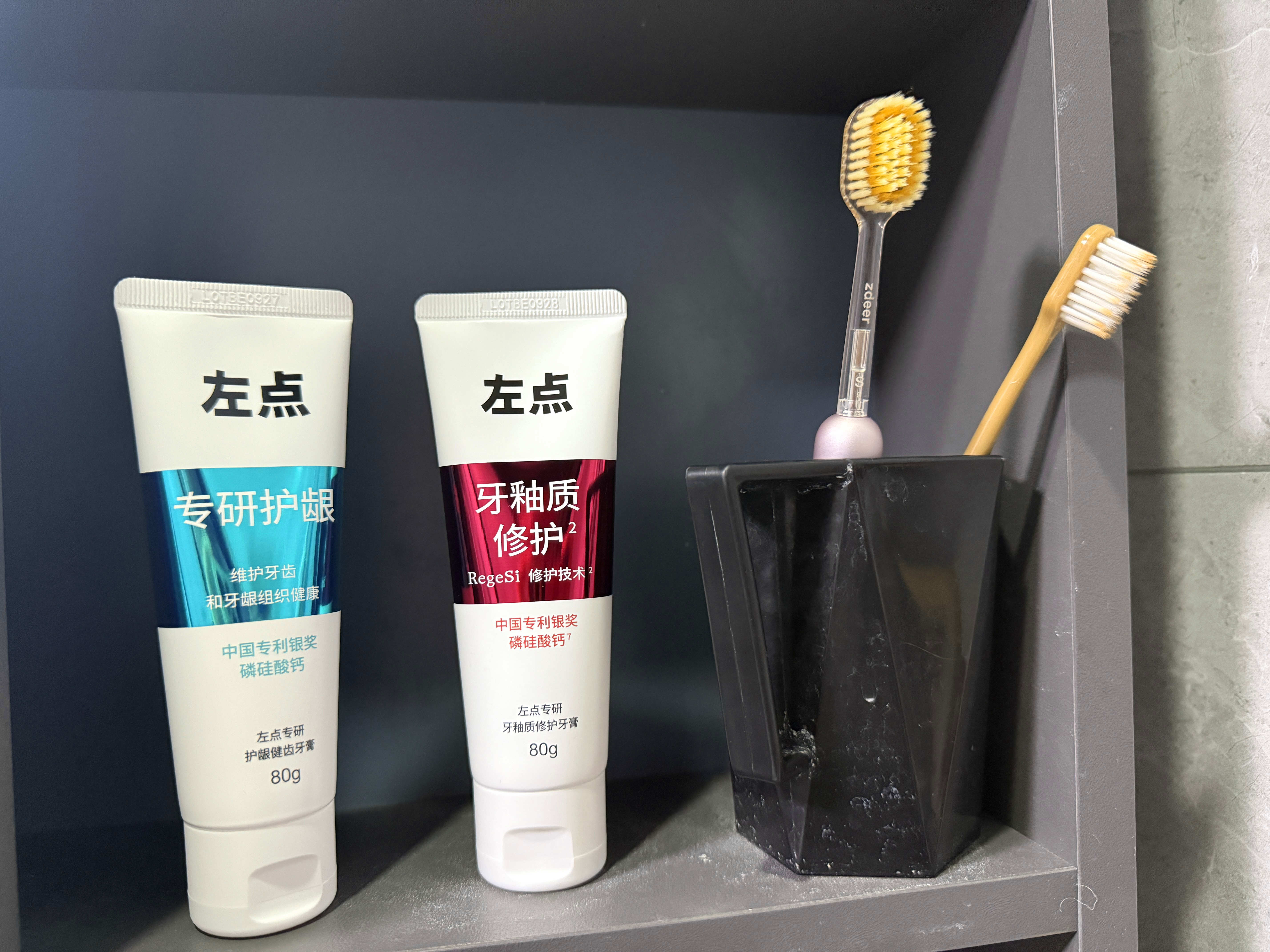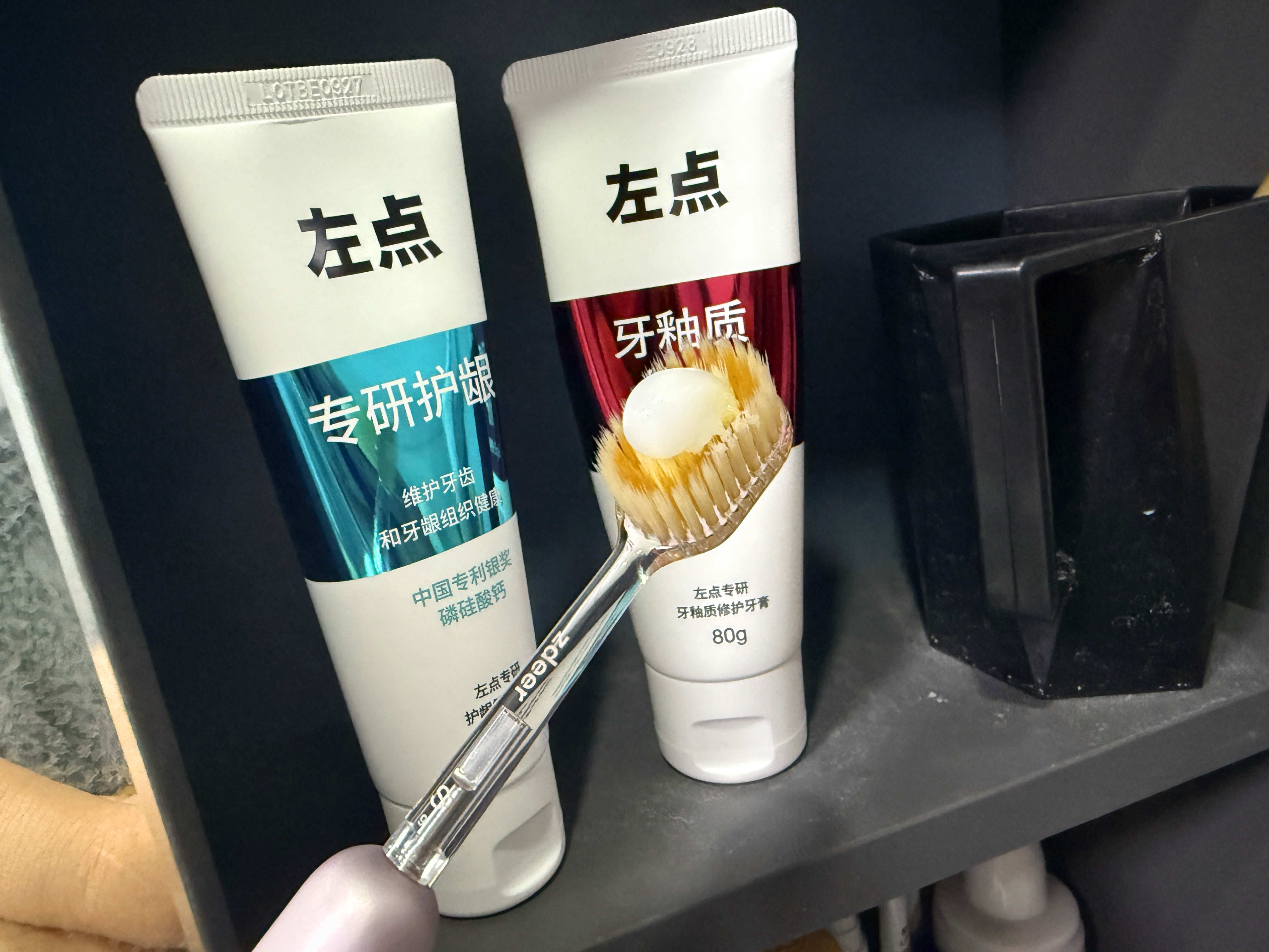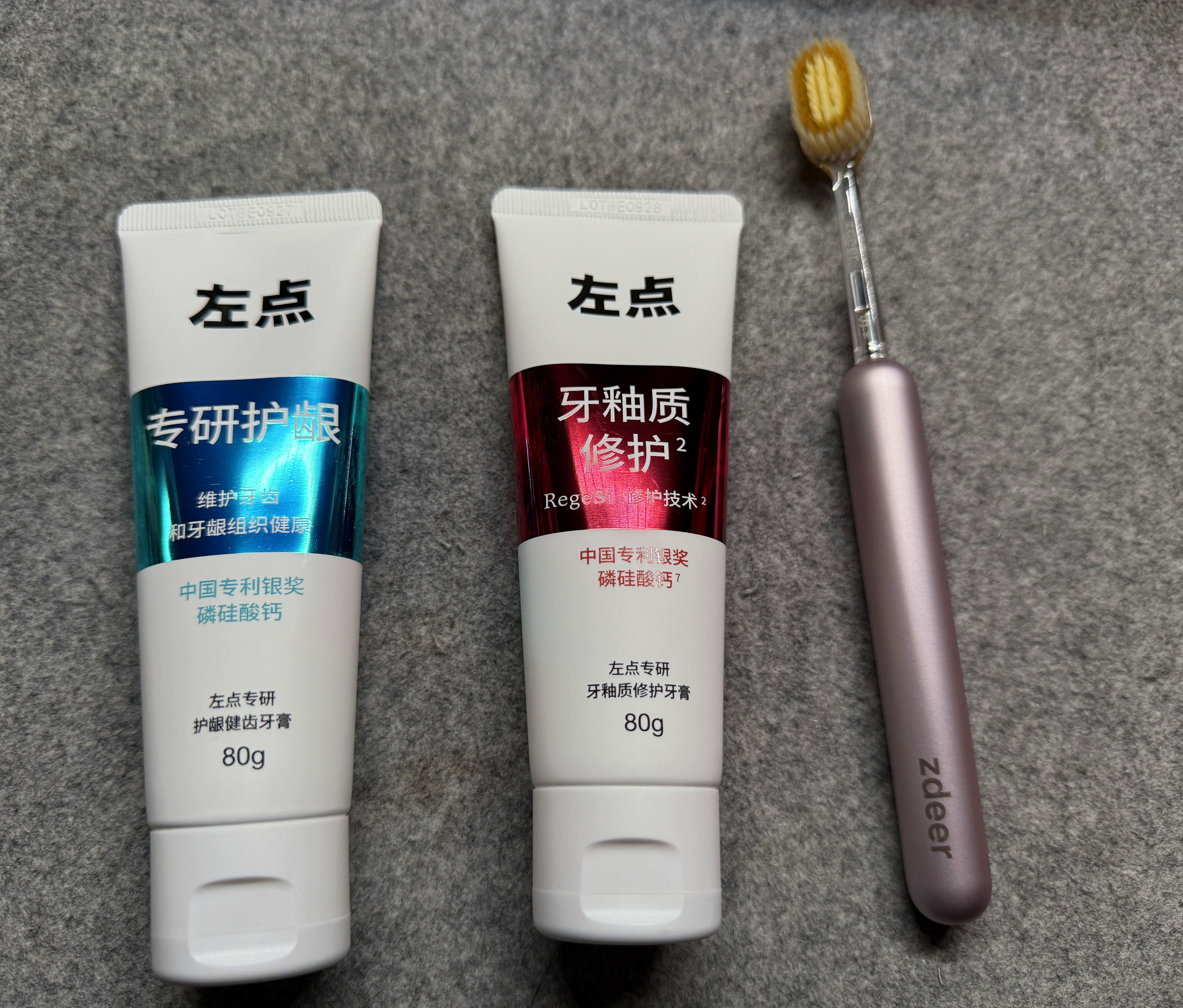 左点轻奢艺术牙刷与左点再生硅牙膏专研牙釉质修护系列、专研护龈健齿系列的组合,堪称口腔护理的“黄金搭档”。牙刷颜值惊艳,航空级铝合金机身搭配精湛工艺,握感舒适且防滑,细节之处尽显品质;超细杜邦刷毛与三合一刷丝设计,清洁力强又呵护牙龈,磁吸刷头与贴心褪色提示丝,使用便捷又实用。而专研牙膏实力同样出众,RegeSi再生硅修护牙釉质,解决牙齿敏感、溃疡等难题,还能提升牙齿硬度;防龋齿、抗糖酸,纯净0添加,用着安心;抑菌又清新口气,美白去渍效果更是显著。二者搭配使用,让日常口腔护理变得轻松又高效,不仅提升了生活品质,更让我们拥有健康洁白的牙齿和清新的口气,自信绽放笑容。如果你也想改善口腔状况,不妨试试这套组合!