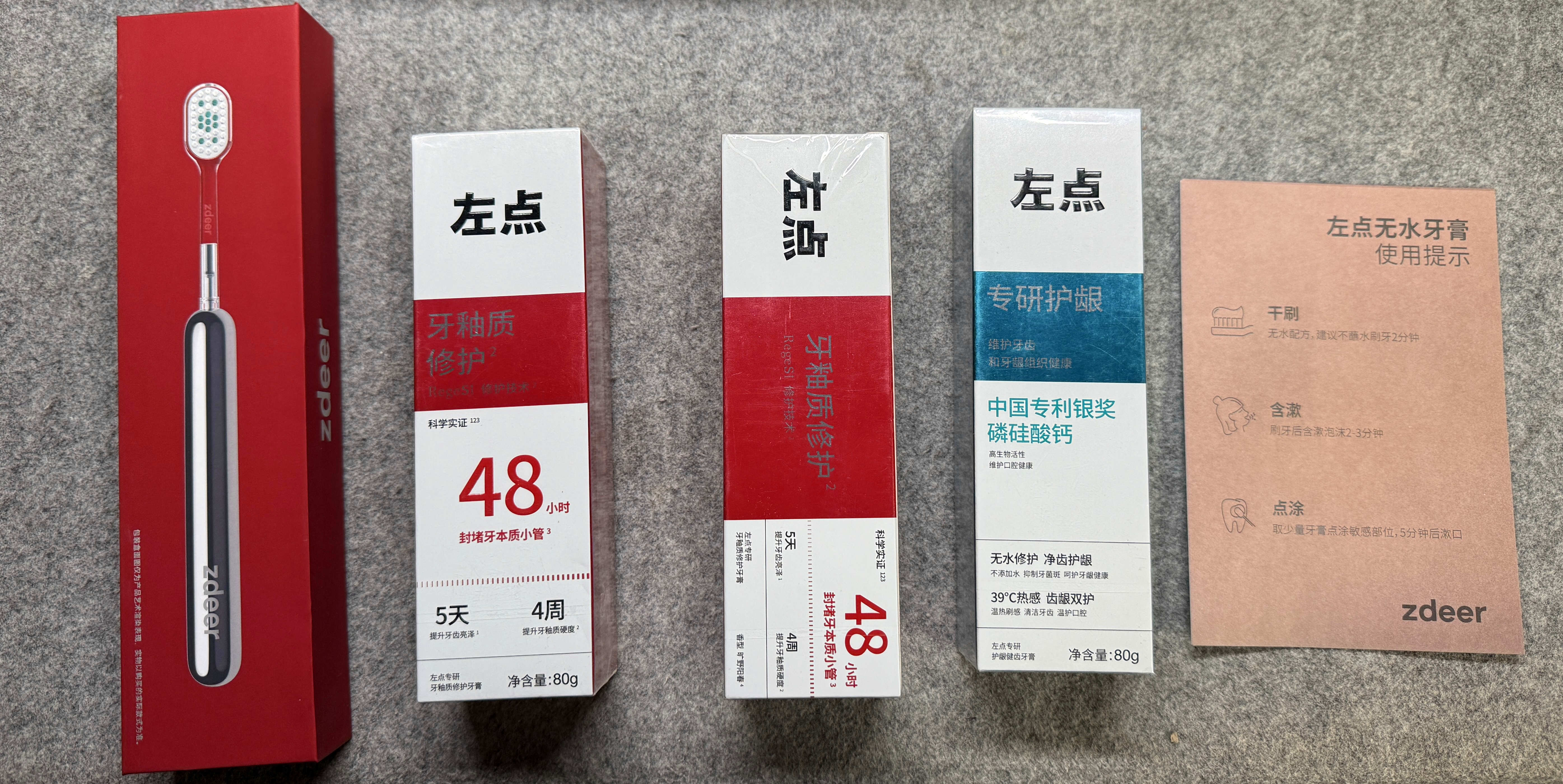 收到产品还是很惊喜,包装还是一贯的左点包装习惯,红色的包装看着就喜庆,拆开包装可以看到一只粉色的牙刷,另外我还多准备3盒新品——左点再生硅牙膏。