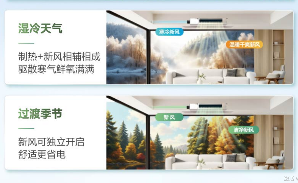 在夏季,高温的室外空气经过室内机的处理,温度得到有效控制,同时湿度也被调节到合适的范围。这样的新风,不会让我们感到闷热和潮湿,有助于保持室内的清爽。而在冬季,湿冷的空气经过处理后,变得温暖而宜人,为我们营造了一个舒适的室内环境。
