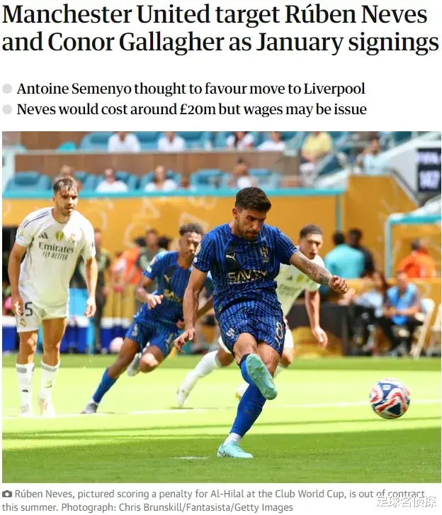 JJ指出,阿莫林希望优先选择签下有英超经验的球员,比如内维斯和加拉格尔,其中28岁的内维斯合同明年夏天到期,一月份签下他大约需要2000万英镑,不过这名中场35万英镑的周薪可能是个阻碍,而且他也有可能和利雅得新月续约。