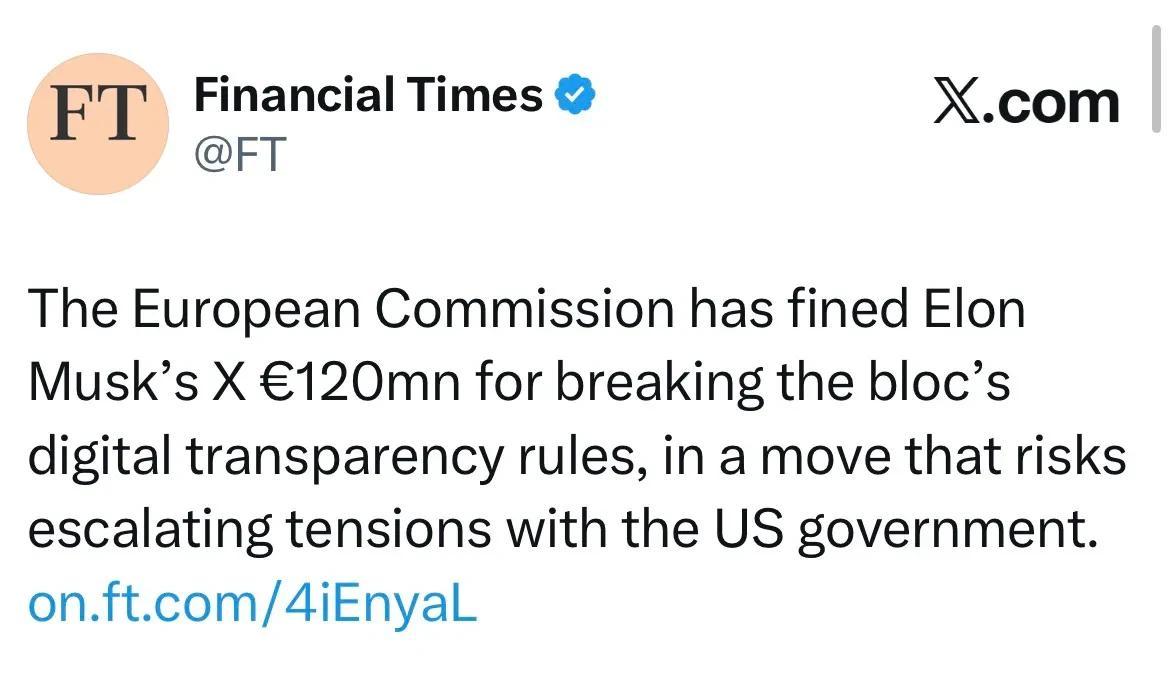 金融时报报道:欧盟委员会因埃隆·马斯克的推特X违反欧盟数字透明度规则,对其处以1.2亿欧元的罚款,此举可能加剧欧盟与美国