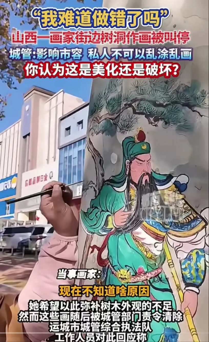 树干作画添彩反遭城管叫停!画家委屈喊冤“美化有错?” 一场街头创作引发市容与创意的激烈碰撞山西街头,一位画家留意到路旁不