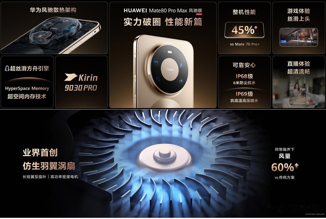 其实,风驰版是指这款手机搭载华为风驰散热架构。简单来说,这款手机是在华为Mate80 ProMax的基础上魔改了散热,加了一个物理风扇,以此提升散热彻底释放麒麟9030Pro的性能,让这款手机主打性能(走电竞路线)。