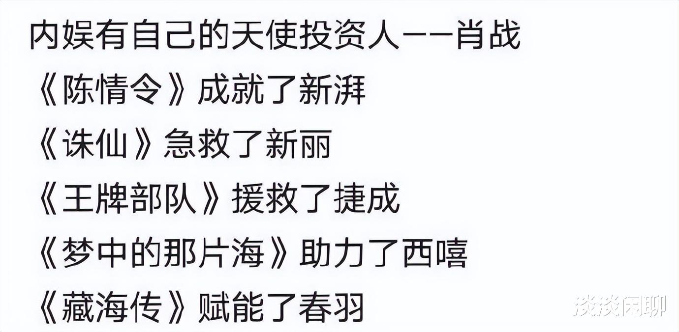肖战被称为内娱天使投资人,诚不欺人。《陈情令》成就了新湃,火遍全球;《诛仙》救急了新丽,获8倍营收;《王牌部队》援救了捷成,在财报上大放异彩;《梦中的那片海》助力了西嘻,成为现象级大爆剧;《藏海传》赋能春羽,再次全球大爆。就这成绩,肖战真神人是也,财神爷是也。