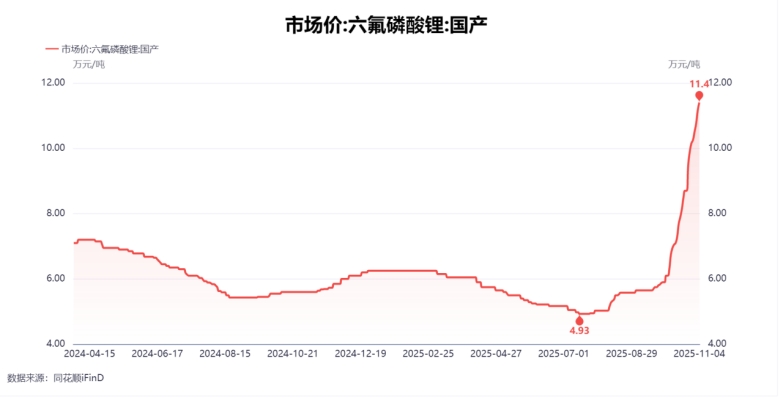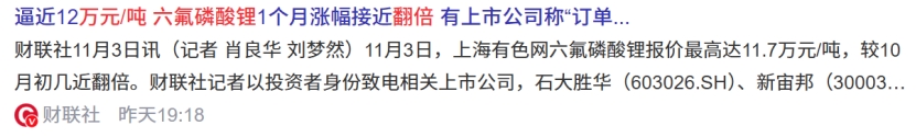11月3日,上海有色网六氟磷酸锂报价最高达11.7万元/吨,较10月初几近翻倍。