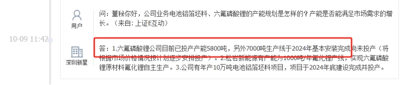六氟磷酸锂产能:在互动平台上,表示六氟磷酸锂公司目前已投产产能5800吨,另外7000吨生产线于2024年基本安装完成尚未投产(将根据市场价格情况按计划逐步安排投产),也就是说如果价格进一步上涨,这7000吨产能将随时进行生产。