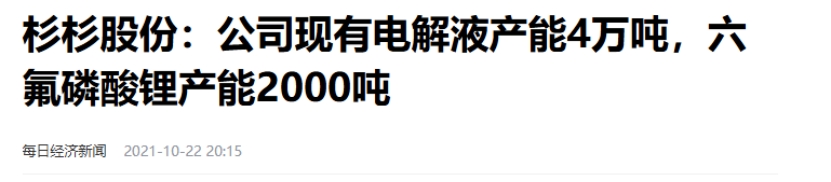 六氟磷酸锂产能:公司现有电解液产能4万吨,六氟磷酸锂产能2000吨。