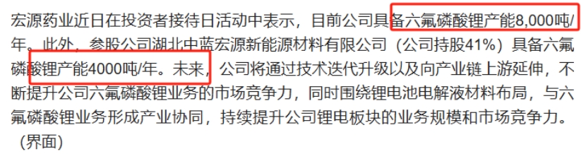 六氟磷酸锂产能:公司在互动平台上表示,公司现有六氟磷酸锂产能8000吨/年、电解液产能25万吨/年。