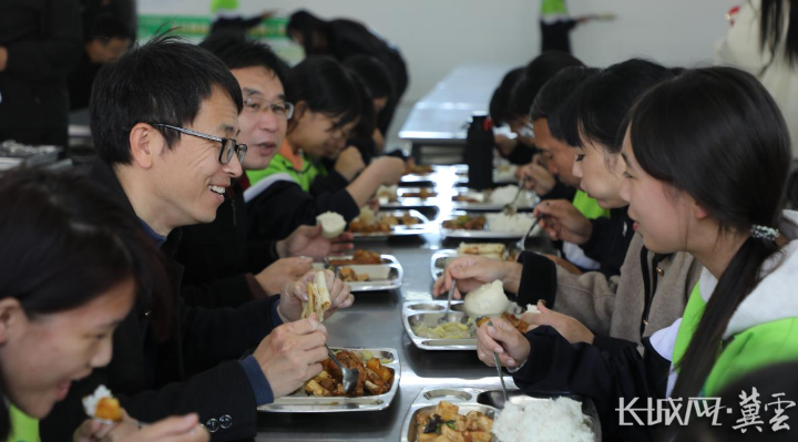 图为在涞水县义安中学食堂就餐区,涞水县教育和体育局工作人员正在与学生一起用餐。通讯员 徐梓钰 摄