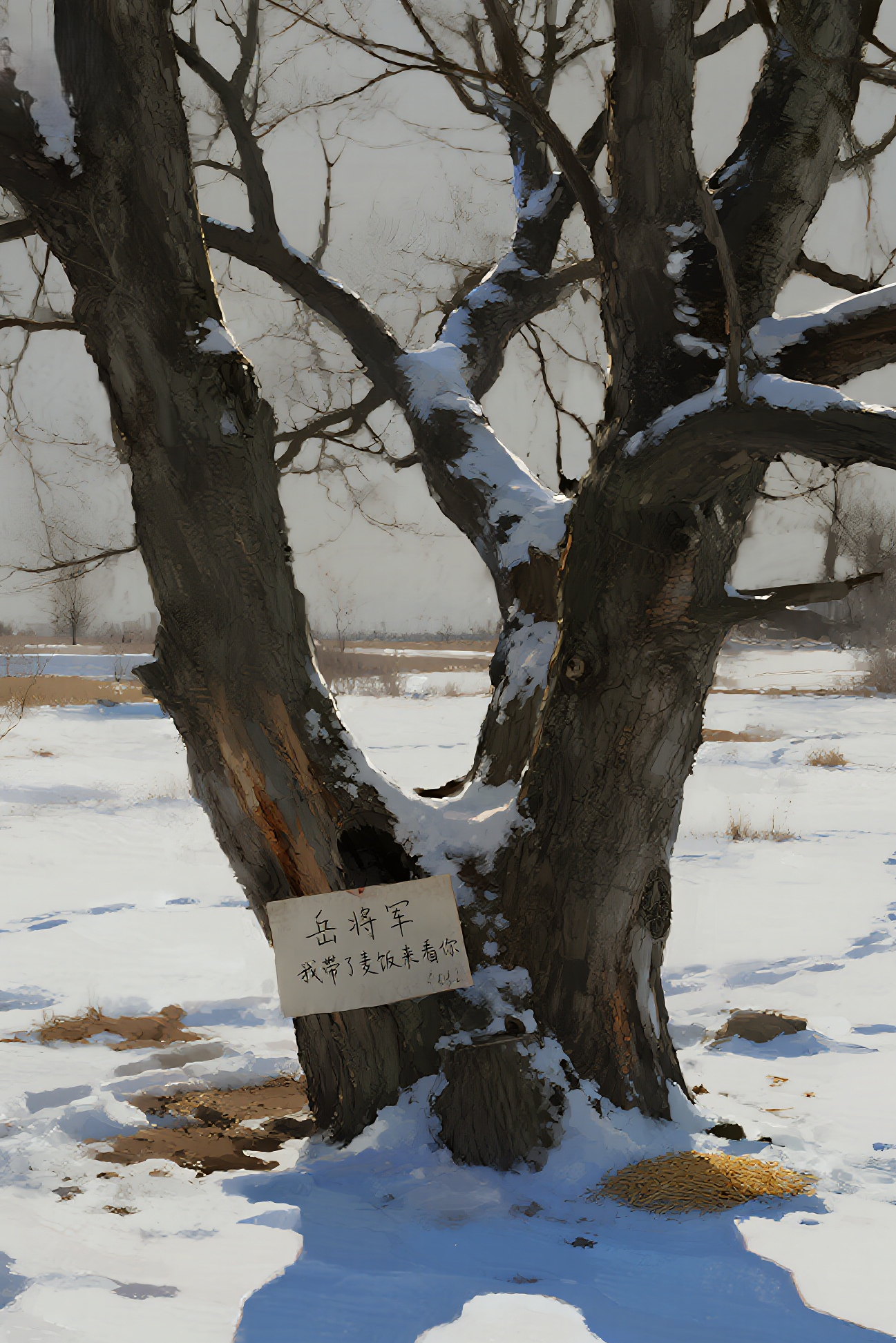 雪越下越大,把岳飞的身体盖得严严实实。就像母亲的手,温柔地抱着他,带他回汤阴的麦场,回朱仙镇的军营,回那个“杀金兵、吃麦饭”的梦……