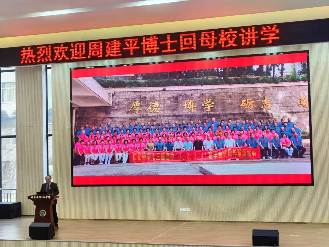 12月20日下午,广东省韶关市仁化中学学术报告厅座无虚席,暖意融融。学校百年校庆系列活动之“优秀校友讲座”在此隆重举行。会场内灯光庄重,气氛热烈,师生齐聚一堂,共同聆听一场跨越时空的精神对话。1973届校友被特别安排在第一排就座,目光中满是期待与温情。这场以《百年薪火:求索与回响》为主题的演讲,不仅是一次个人经历的深情回顾,更是一代仁中人精神传承的生动写照。