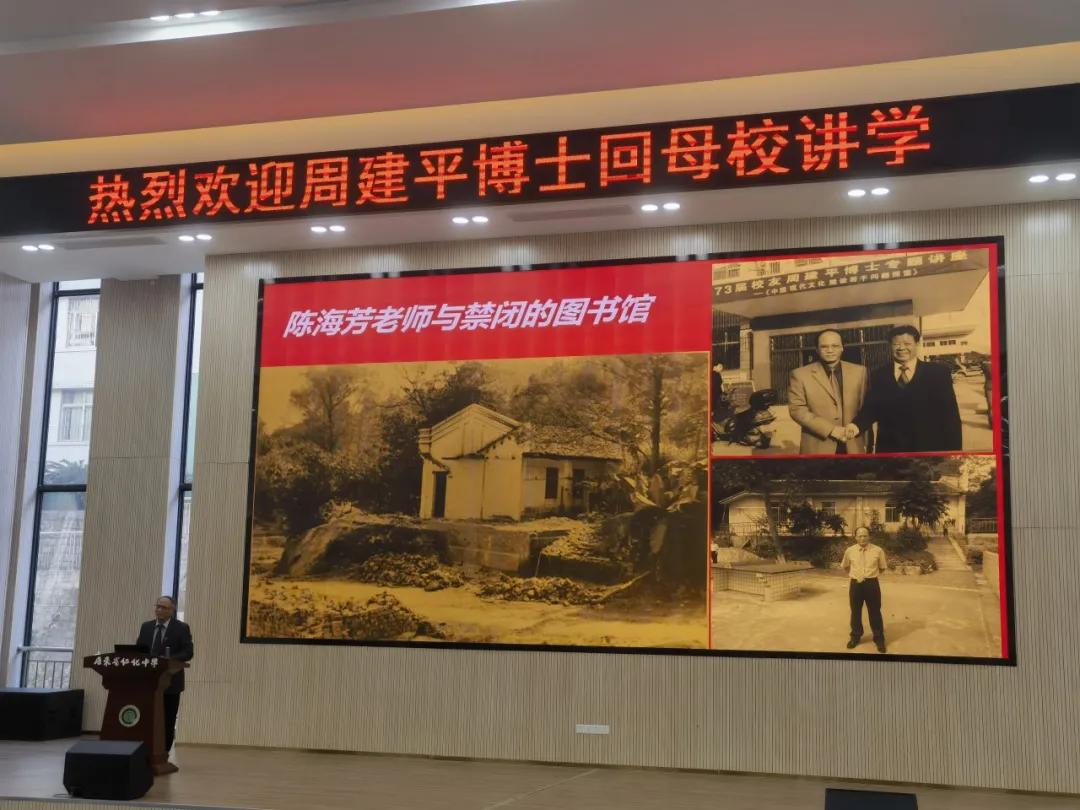 周建平博士缓步走上讲台,他身着笔挺西装,目光坚定,声音沉稳有力。窗外绿意隐约可见,整个空间凝聚着专注与敬意。这一刻,一位从仁化中学走出的文化大家,正将他的生命历程娓娓道来。