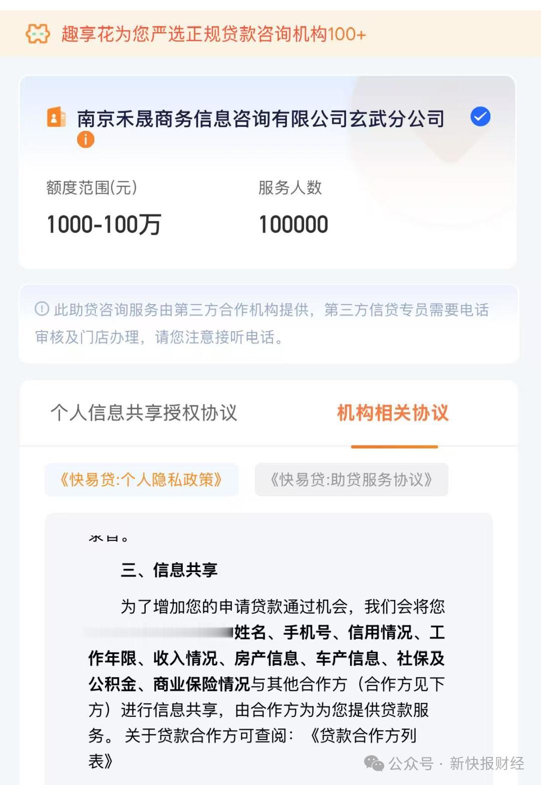 然而,用户留在趣享花平台的个人信息,经过导流第三方中介后,还会继续被共享流转。比如,在趣享花导流的下游贷款中介南京禾晟商务信息咨询有限公司玄武分公司相关协议中,约定“为了增加用户的申请贷款通过机会,其会将用户的个人信息,包括姓名、手机号、信用情况、工作年限、收入情况、房产信息等,与其他合作方进行信息共享”。
