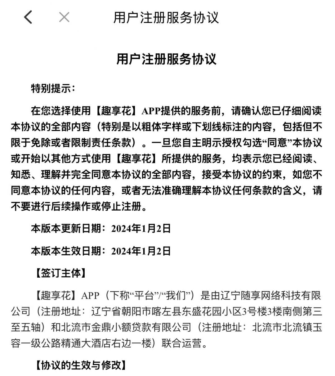 据了解,趣享花是人品借款的重要合作方,承接了人品借款大量流量资源。此外,趣享花称与小贷公司联合运营,也存在涉嫌“借牌经营”的合规争议。根据趣享花服务协议,趣享花是由辽宁随享网络科技有限公司和北流市金鼎小额贷款有限公司联合运营。